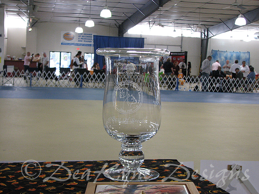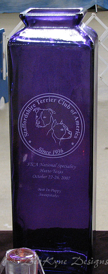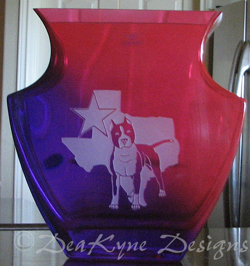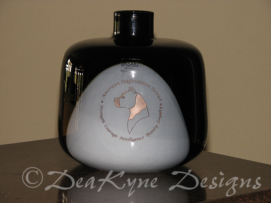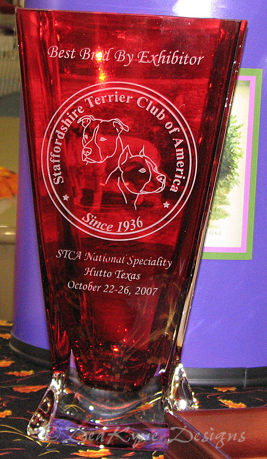 Combining her fine arts background, a love of animals, and fascination with glass, she produces a variety of work depicting American Staffordshire Terriers, wild and domestic animals. Specializing in sculpting glass to create designs that play off light and color, her architectural projects are featured internationally in restaurants, commercial buildings, the U.S. Capitol, and private residences. She has provided glass trophies for STCA National shows, International dog shows, and other pet shows.