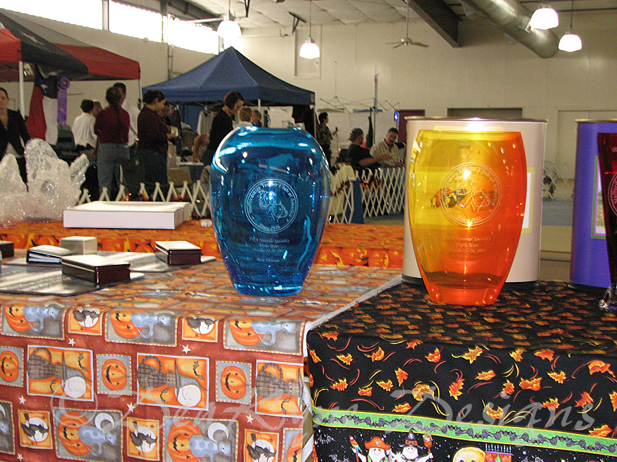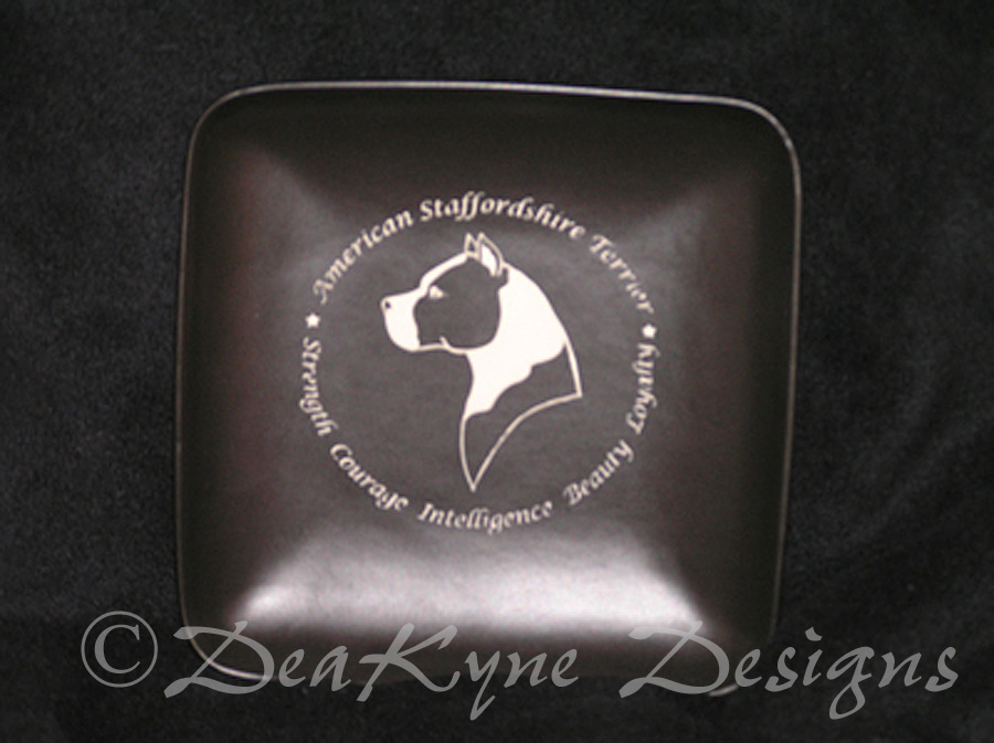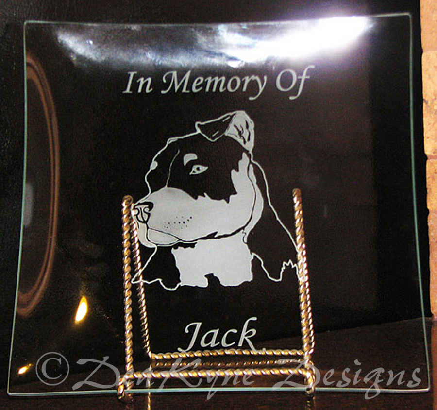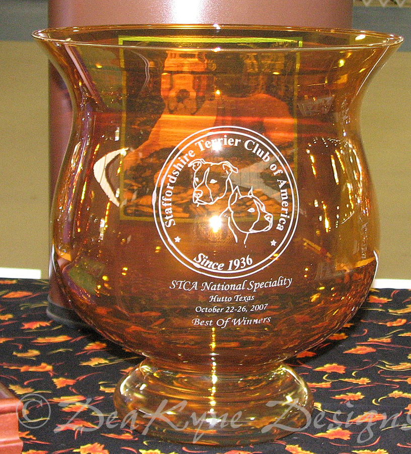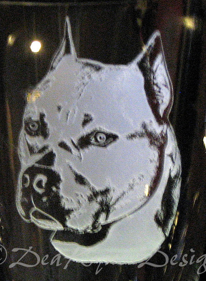 Combining her fine arts background, a love of animals, and fascination with glass, she produces a variety of work depicting American Staffordshire Terriers, wild and domestic animals. Specializing in sculpting glass to create designs that play off light and color, her architectural projects are featured internationally in restaurants, commercial buildings, the U.S. Capitol, and private residences. She has provided glass trophies for STCA National shows, International dog shows, and other pet shows.