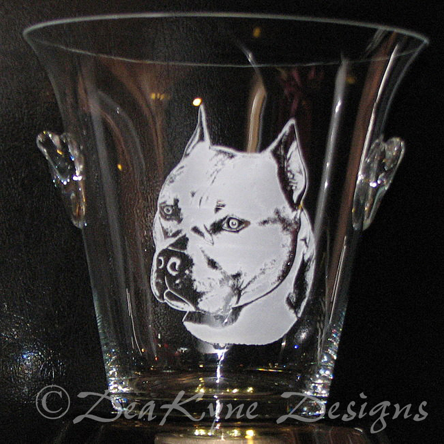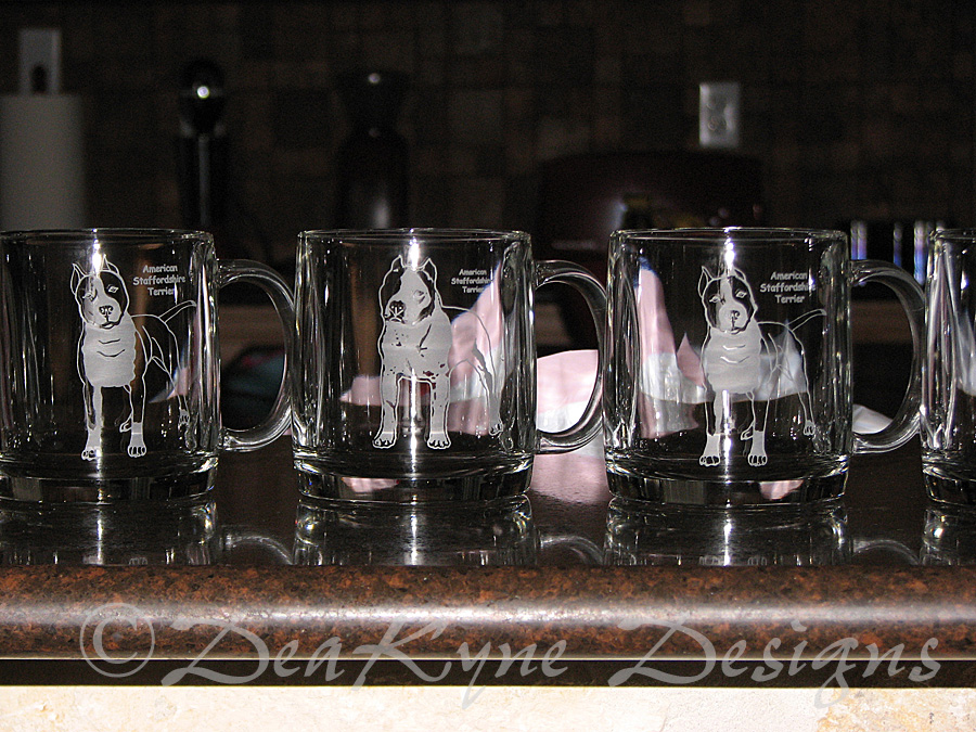 Because of her passion for amstaffs, she has designed an art glass collection of amstaffs at play, head studies, and stacked. "I've had amstaffs since 1993 including: Ch. Whistle Valley Special Edition (Samson) and Matrix's Penny From Heaven (Penny)." Current amstaffs are Leo and Ruby.
